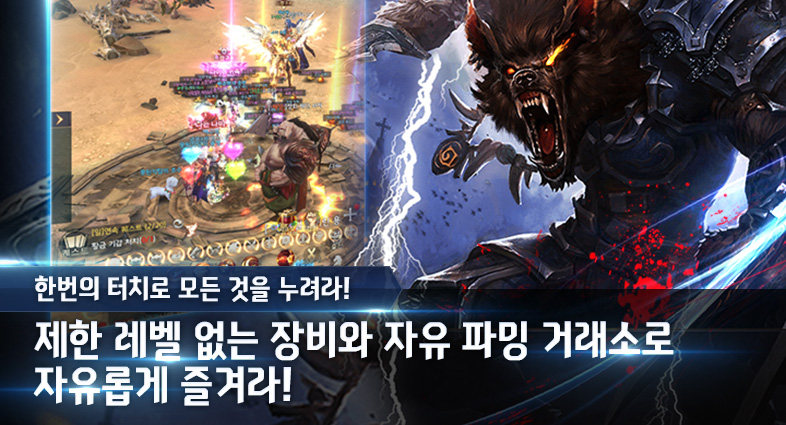 제한 레벨 없는 장비와 자유 파밍 거래소로 자유롭게 즐겨라!